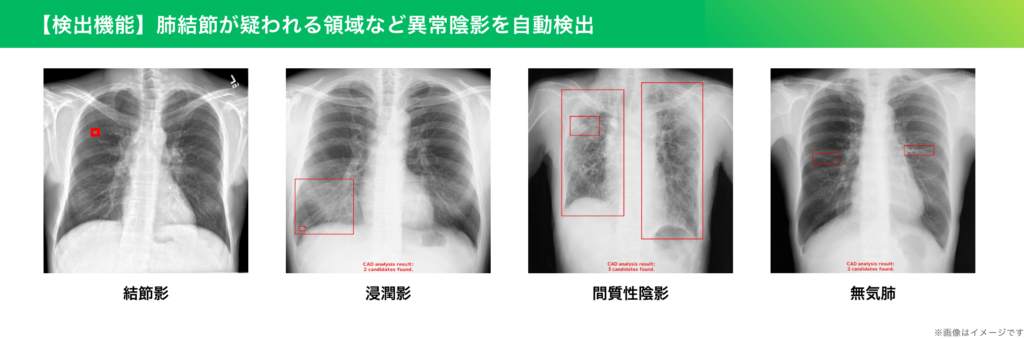 胸部単純写真において、肺がんを疑う所見などをAIが的確に検出します。もし疑わしい所見があった場合には、そのまま当院で胸部CTなどによる精密検査を行い、真の異常かどうかを判断することができます。